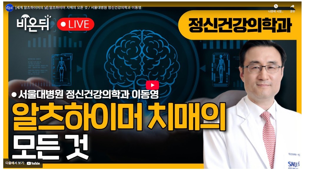 [¼¼°è ¾ËÃ÷ÇÏÀ̸ÓÀÇ ³¯] ¾ËÃ÷ÇÏÀÌ¸Ó Ä¡¸ÅÀÇ ¸ðµç °Í 9¿ù 21ÀÏ ¼¼°è ¾ËÃ÷ÇÏÀ̸ÓÀÇ ³¯À» ¸Â¾Æ, Ä¡¸Å¿¡ ´ëÇÑ Á¤È®ÇÑ ÀÌÇØ¿Í ´ëÀÀÀÌ ´õ Áß¿äÇØÁö°í ÀÖ½À´Ï´Ù. ¼¿ï´ëº´¿ø Á¤½Å°Ç°ÀÇÇаú À̵¿¿µ ±³¼ö°¡ Ãâ¿¬ÇØ ¾ËÃ÷ÇÏÀÌ¸Ó Ä¡¸ÅÀÇ ¿øÀÎ, Ãʱâ Áõ»ó, Áø´Ü ¹× Ä¡·á¹ý, ±×¸®°í °¡Á·°ú ȯÀÚ°¡ ÇÔ²²ÇÒ ¼ö ÀÖ´Â µ¹º½ Àü·«±îÁö Æø³Ð°Ô ¼³¸íÇÕ´Ï´Ù. Ä¡¸Å°¡ °ÆÁ¤µÇ½Ã°Å³ª °¡Á· Áß È¯ÀÚ°¡ ÀÖ´Ù¸é, ¹æ¼Û Áß ½Ç½Ã°£ äÆÃÀ¸·Î ±Ã±ÝÇÑ Á¡À» Áú¹®Çغ¸¼¼¿ä. #¼¼°è¾ËÃ÷ÇÏÀ̸ÓÀdz¯ #À̵¿¿µ #¼¿ï´ëº´¿ø #¾ËÃ÷ÇÏÀ̸ÓÄ¡¸Å #Á¤½Å°Ç°ÀÇÇаú ´ã´ç: ±èÁØÇå °¨µ¶, ±è½Ì¾Æ PD [»çÀü Áú¹® ¹× ¹®ÀÇ ¾È³»] ¶óÀÌºê »çÀü Áú¹®°ú ¹®ÀÇ»çÇ×Àº ºñ¿ÂµÚ °ø½Ä ȨÆäÀÌÁö¿¡ ³²°ÜÁÖ¼¼¿ä. ºñ¿ÂµÚ ȨÆäÀÌÁö: http://aftertherain.kr [À¯ÀÇ»çÇ× ¾È³»] º» ¿µ»óÀº Áö½Ä ³ª´®À» ÅëÇÑ Á¤º¸ Àü´ÞÀ» ¸ñÀûÀ¸·Î Çϸç, ¾î¶°ÇÑ °æ¿ì¿¡µµ ÀÇ»çÀÇ Áø·á¸¦ ´ë½ÅÇÒ ¼ö ¾ø½À´Ï´Ù. ºñ¿ÂµÚ´Â Ã⿬ º´¿øÀÇ ±ÝÀüÀû Áö¿ø ÀÏÀý ¾øÀÌ ¹æ¼ÛÀ» Á¦ÀÛÇϰí ÀÖ½À´Ï´Ù.